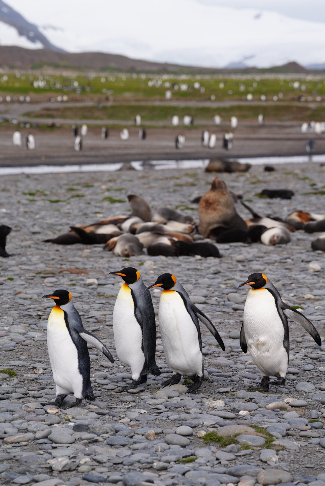 Neben den Zodiac Cruises gibt es auch Landings – nach Tagen auf dem Wasser, endlich wieder Land unter den Füßen. Man fährt mit dem Zodiac an Land. Wir waren bei einer alten Whaling Station. Am zweiten Tag ging’s um 7 Uhr schon los zu unserem zweiten Landing: Salisbury Plain, South Georgia. Und hier waren SO viele King Pinguine – 40.000 Pinguin Paar und deren Babys – echt der Wahnsinn! Nach dem Landgang hatten wir noch einen Zodiac Cruise – eigentlich hätten wir sogar noch einen gehabt, allerdings wurde es leider zu windig (100km/h) und demnach zu gefährlich. Das ist natürlich ärgerlich, kann aber passieren und das ist eben die Natur. Am 3. Tag kamen wir beim Cooper Bay und am Gold Harbour an und leider ist auch hier der Zodiac Cruise ausgefallen. Trotzdem konnten wir vom Schiff aus die Bucht und die Strände sehen, die voll mit Pinguinen und Seelöwen waren.
