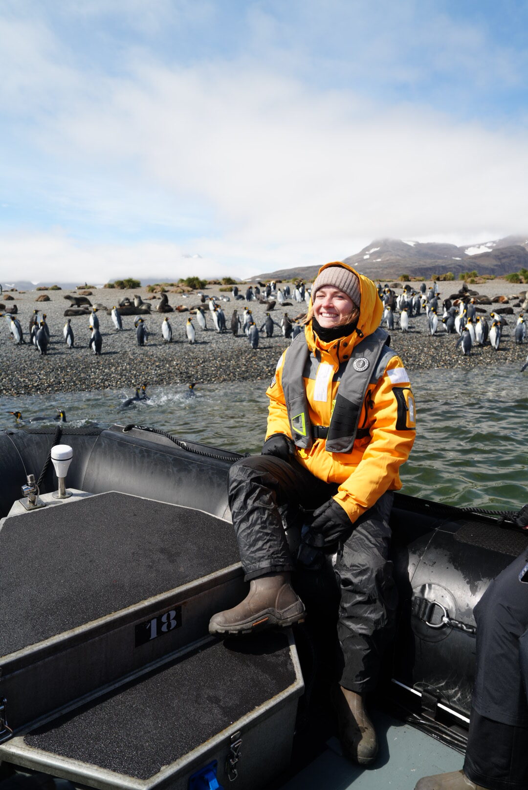 Erster Stop: Elephant Island, noch kurz vor der Antarktis. Während der Fahrt haben wir so so viele Wale, Pinguine und riesige Vögel gesehen – echt unfassbar! Und dann fand unsere erste Zodiac Tour in der Antarktis statt!! Wichtig dabei: mehrere Schichten anziehen, es kann nämlich echt super kalt werden auf dem Art Schlauchboot. Wasserfeste Hosen sind ein muss, da oftmals auch Wasser ins Boot spritzen kann. Die gestellten Schuhe und Jacken sind wasserfest.