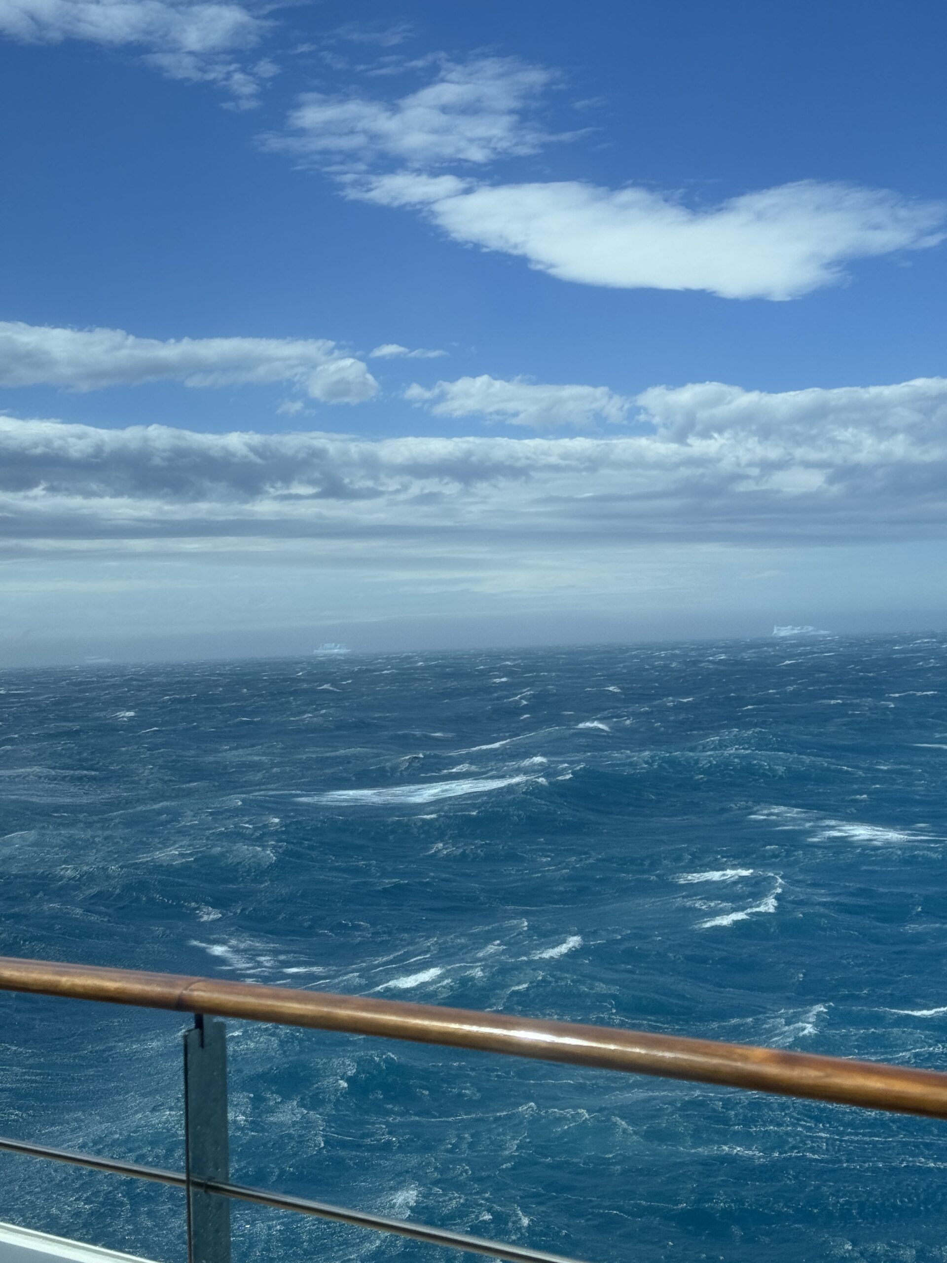 Die Drake-Passage ist DIE berüchtigte Meerenge zwischen Südamerika und der Antarktis, die unglaublich rau sein kann und wo es Wellen von bis zu 10 Metern und im Extremfall sogar 15 Meter geben kann. Wir hatten Wellen bis zu 7 Meter, was uns definitiv gereicht hat. Die Fahrt zwischen Südgeorgien bis in die Antarktis hat 2,5 Tage gedauert. Auf dem Schiff hatten wir aber jeden Tag recht volles Programm von Vorträgen zu der Tierwelt, Natur und Verhaltensregeln für die Antarktis. Wir hatten 3x am Tag verdammt gutes essen und haben ansonsten vom Panorama Deck Eisberge und jegliche Tiere wie Vögel, Seelöwen, Wale und Pinguine im Meer beobachtet.